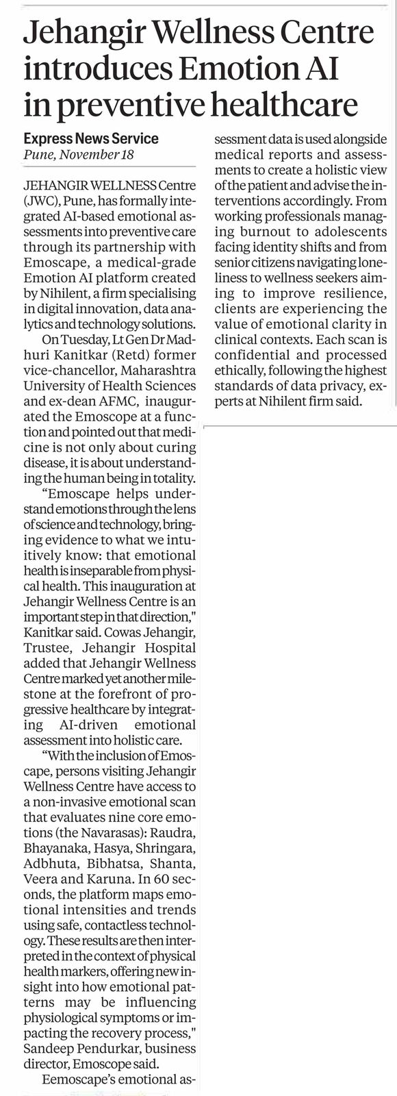 Jehangir Wellness Centre (JWC), Pune, has become the first healthcare institution in the world to formally integrate AI-based emotional assessments into preventive care through its partnership with Emoscape, a medical-grade Emotion AI platform created by Nihilent. This collaboration reflects a significant step forward in the convergence of emotional and physical well-being, placing India at the forefront of human-centric innovation in healthcare.Learn more at https://www.emoscape.ai/
